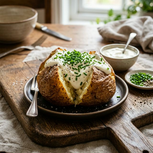 - Servieren: Schneide die heißen Kartoffeln längs ein und gib einen großen Klecks des kühlen Dips direkt in die Mitte.